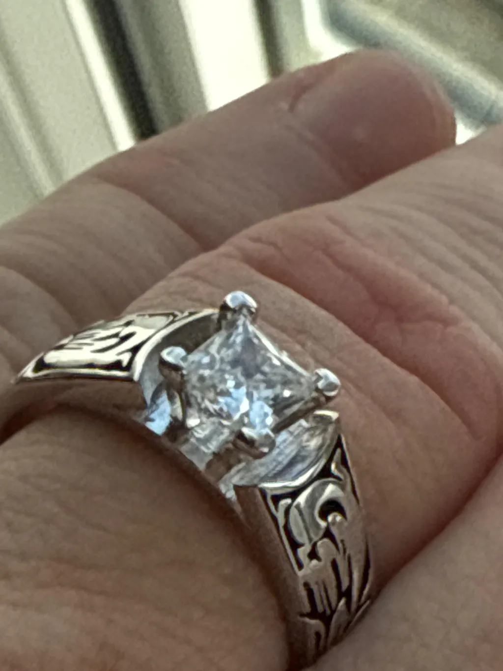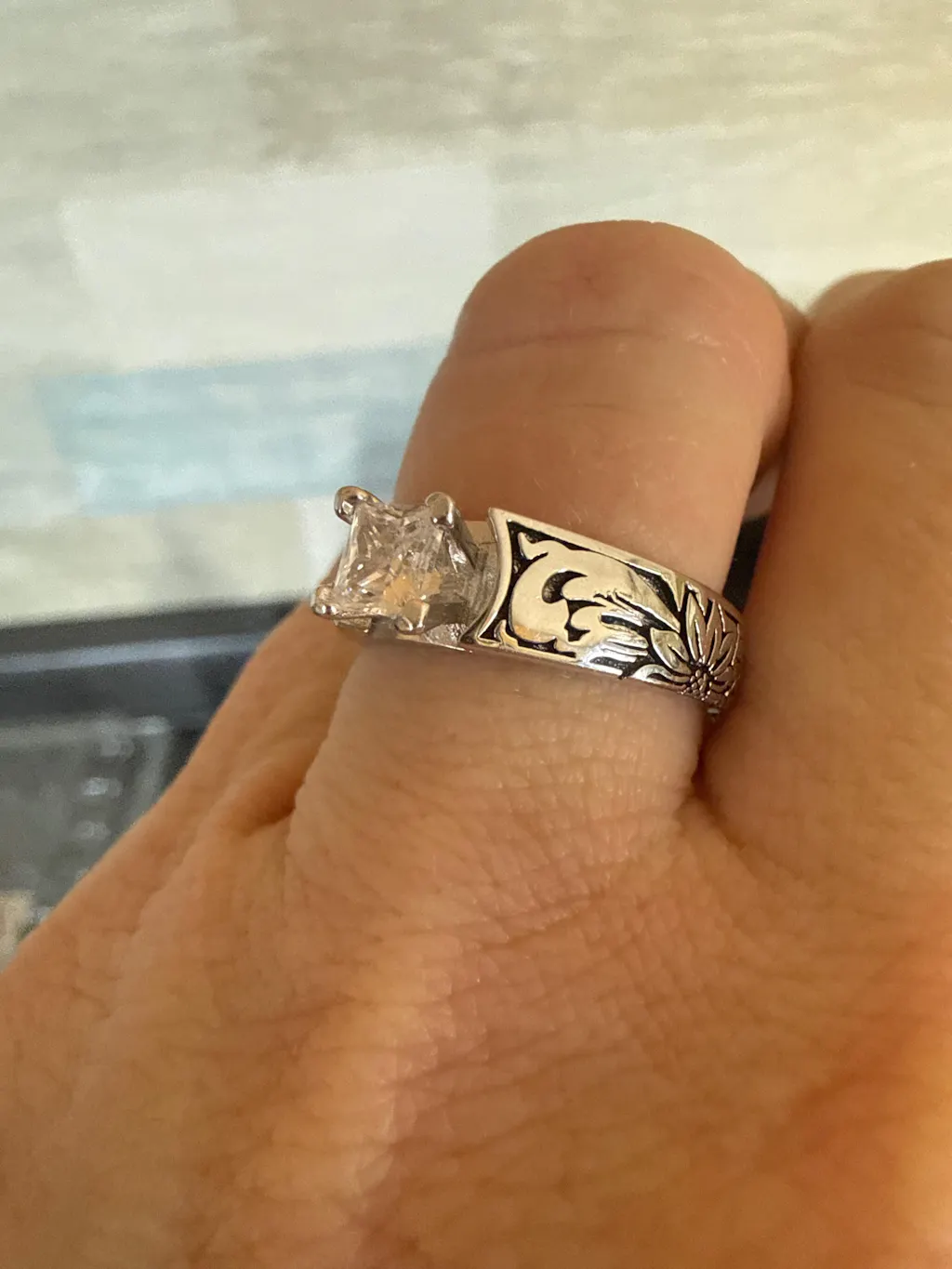 Bought this ring it’s beautiful although the band isn’t as deeply engraved or black like shown in the picture it’s still very pretty!!