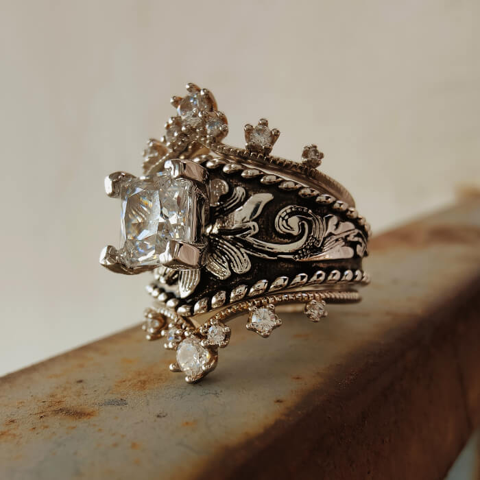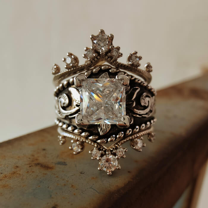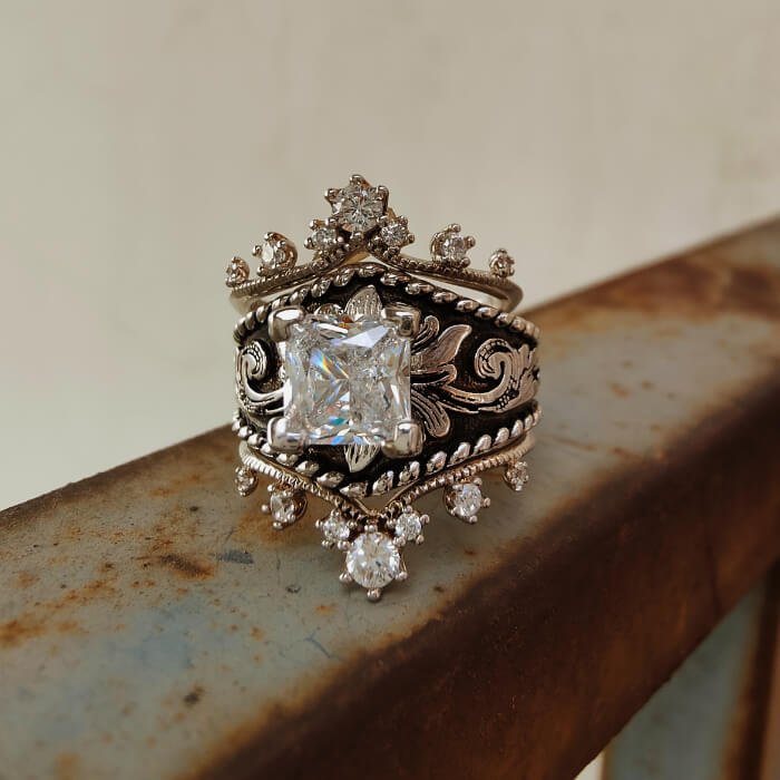 3PC Crown Ring Set – Square Cut Engagement Ring with Vintage Western Detailing
