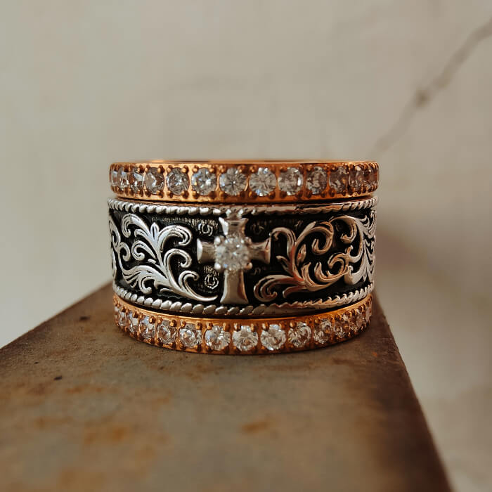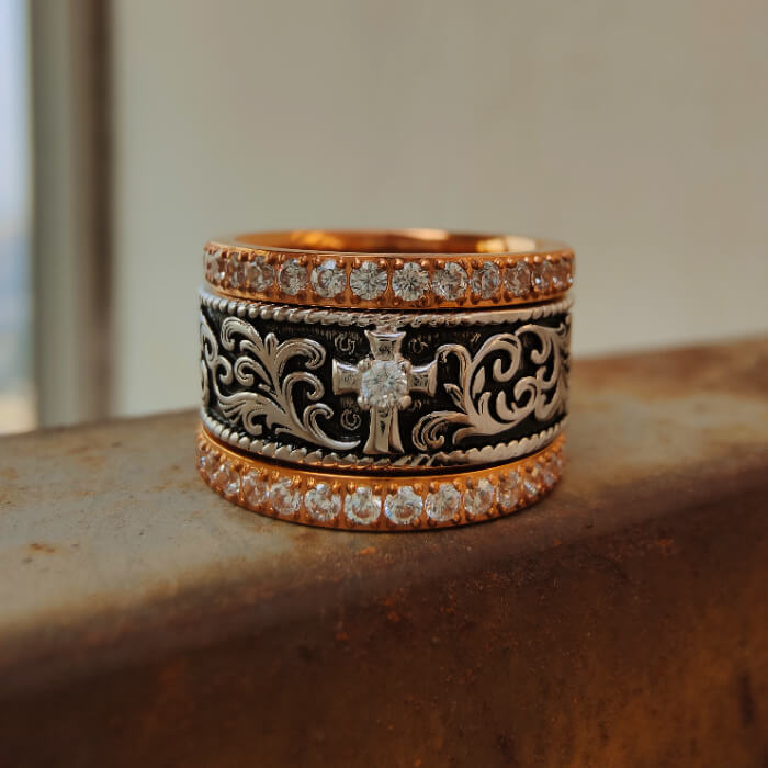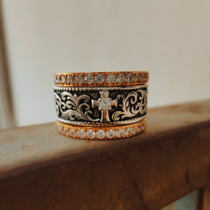 This 3PC Western cross ring set features a bold, vintage-inspired stacked design. The center ring is detailed with classic Western scroll engraving and a raised cross accent set with a clear stone, creating a strong and timeless focal point.