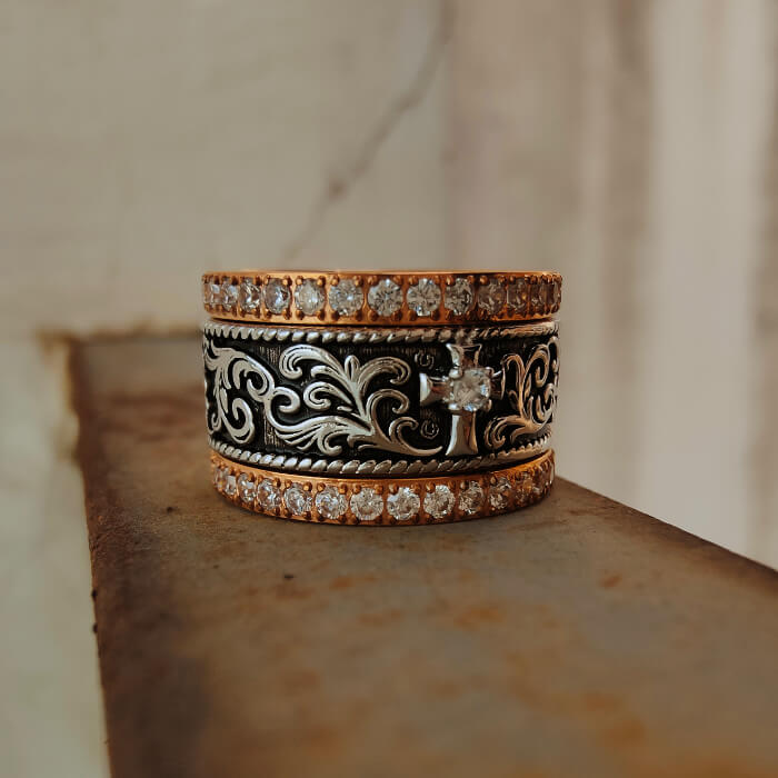 Perfect as a Western wedding ring set, anniversary gift, or everyday statement jewelry, this design is ideal for those who appreciate western rings, engraved details, and stackable band styles with meaning.