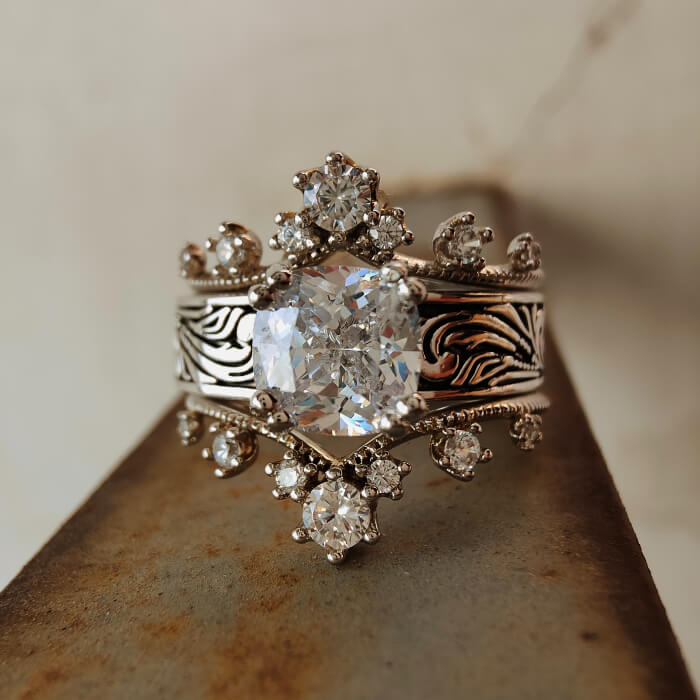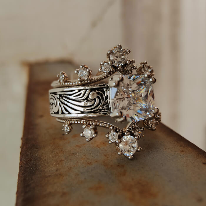 3pc Sterling Silver Diamond Flower Engraed Women's Western Rings