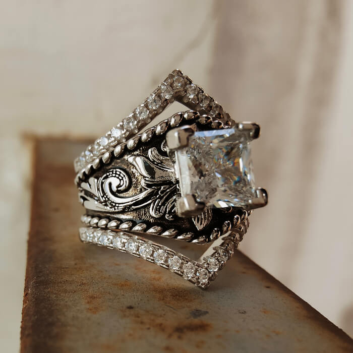 Elevate your jewelry collection with this 3PC vintage Western ring set, featuring a bold square-cut center stone framed by intricate silver scrollwork and sparkling crystal pavé bands. The unique Southwestern-inspired design combines rustic charm with timeless elegance, making it perfect for engagements, anniversaries, or statement wear.