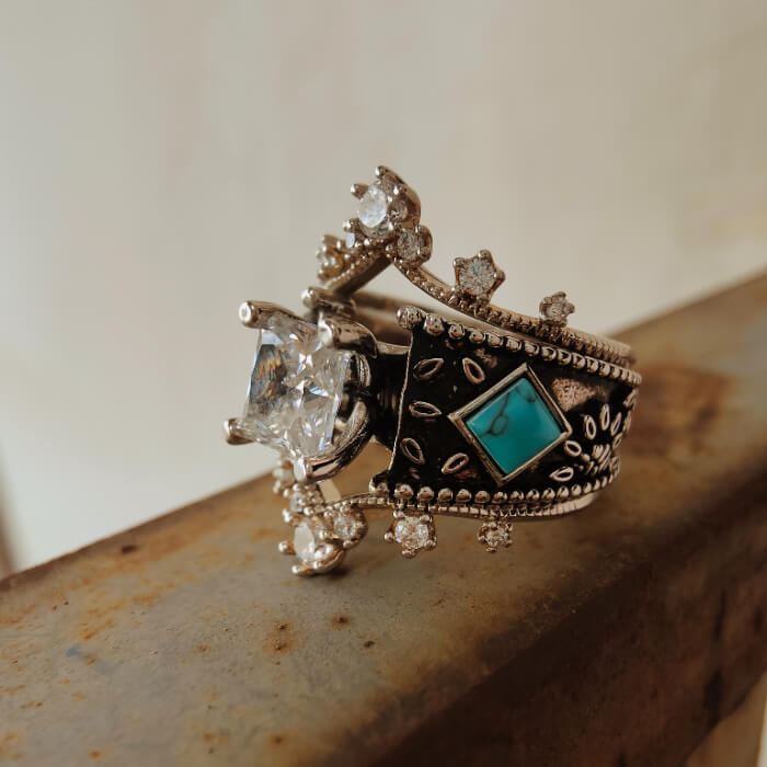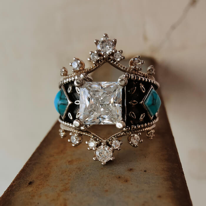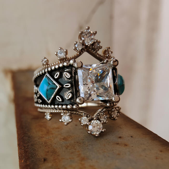 3pc Vintage Women Square Turquoise and Diamond Ring