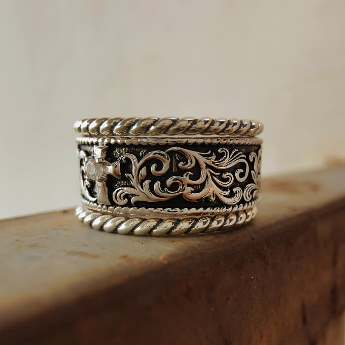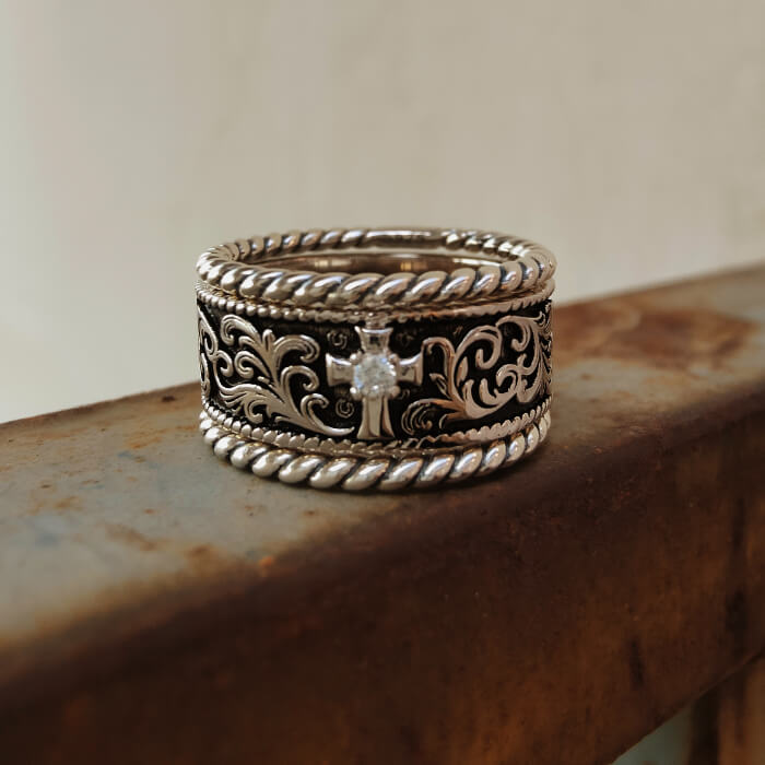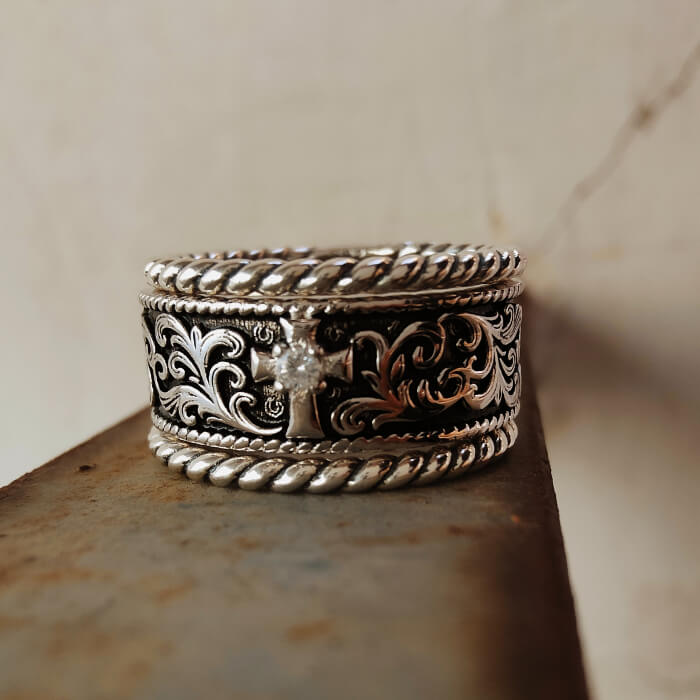 • Center Ring: Brass with white gold plating, Western scroll engraving with cross detail
