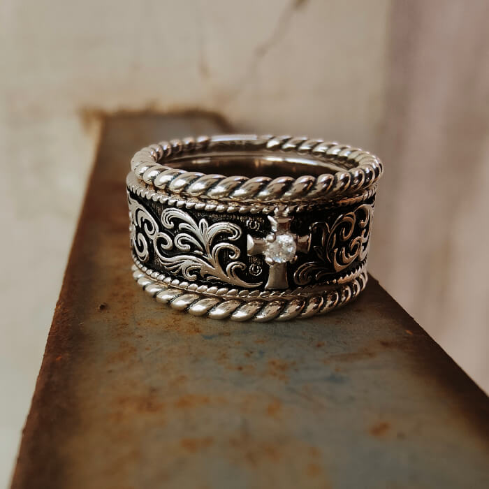 Designed as a Western wedding ring set, anniversary piece, or everyday statement stack, this three-piece design is perfect for those who appreciate western rings, engraved details, and meaningful layered jewelry.