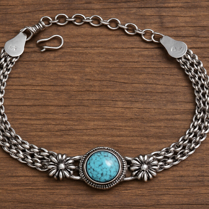 Heavy Woven Silver Turquoise Bracelet – Gothic Floral Cross & Mesh Chain Design