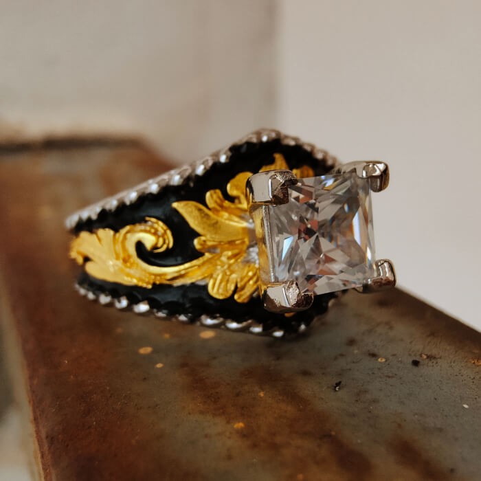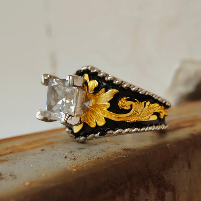 This vintage Western ring features a bold square-cut crystal framed by intricate gold leaf engravings over deep black enamel. The silver rope edges and baroque swirl detailing create a striking contrast — a design that blends royal elegance with rugged Western spirit.