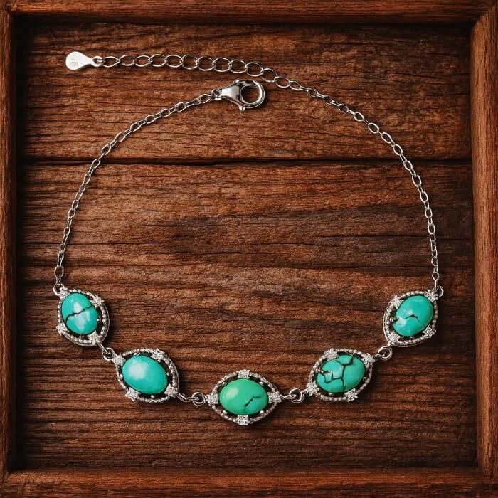 The bracelet features five vibrant, oval-shaped turquoise stones, each carefully selected for its unique color and matrix patterns. Every stone is securely nestled in a detailed 925 Sterling Silver setting, surrounded by a textured "rope" border that adds depth and a vintage oxidized finish.