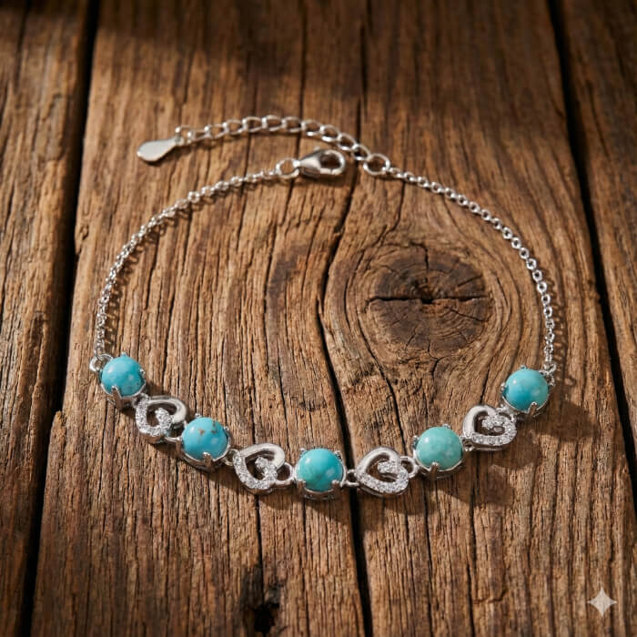 Wear your heart on your sleeve—literally—with this adorable Sparkling Heart & Turquoise Link Bracelet. This piece beautifully combines the protective power of turquoise with the universal symbol of love, creating a jewelry piece that is as meaningful as it is stylish.