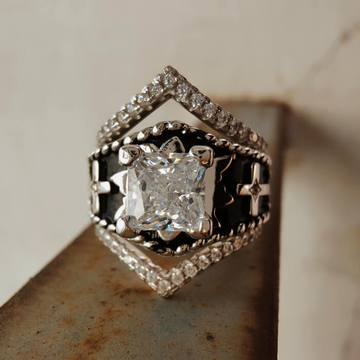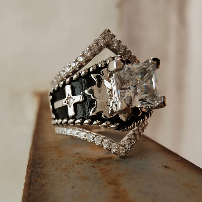 Make a fearless statement with this Western cross ring, featuring a bold square-cut center stone framed by intricate silver details, rope-style edges, and sparkling pavé accents. The black enamel background highlights the silver cross motif, giving the ring a unique fusion of cowboy heritage and gothic edge.