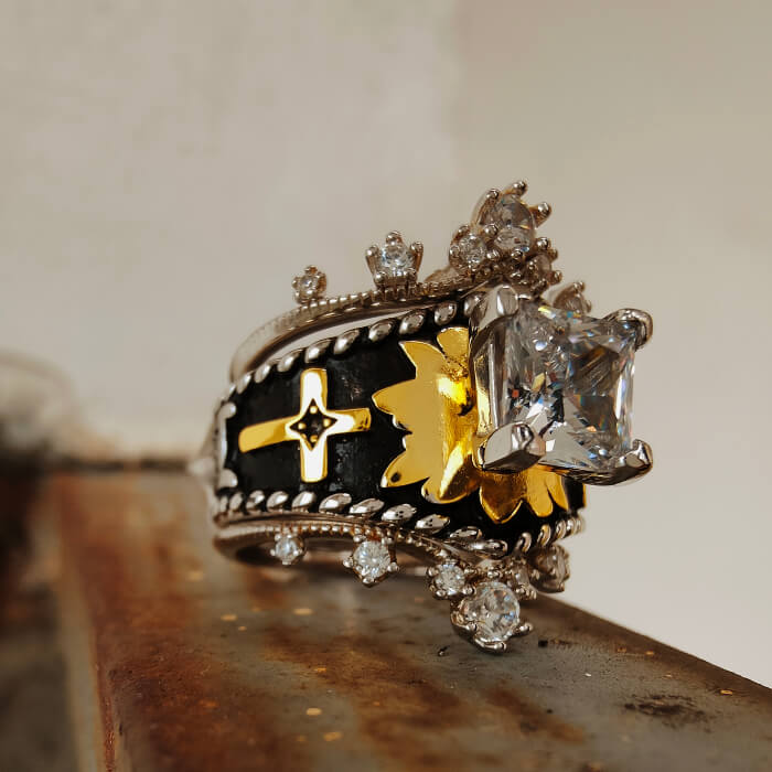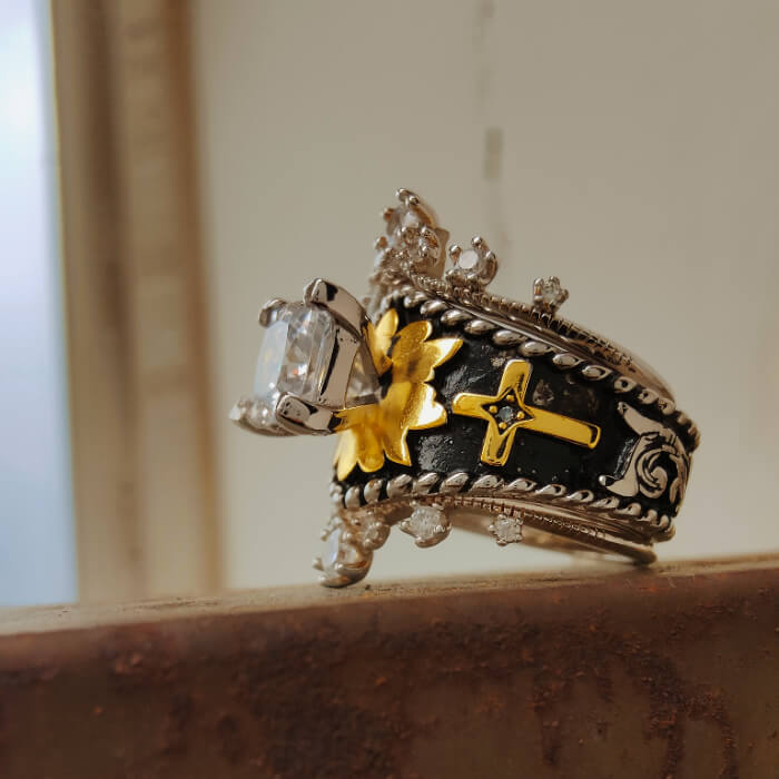 Hand-crafted from copper with silver plating and golden cross engravings, the centerpiece features a radiant princess-cut crystal embraced by two sparkling bands — a perfect symbol of devotion and divine femininity.