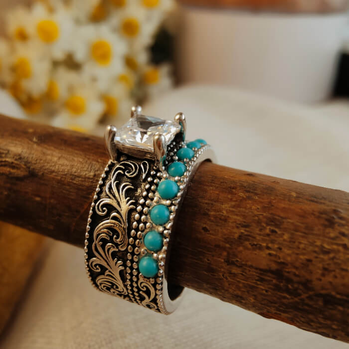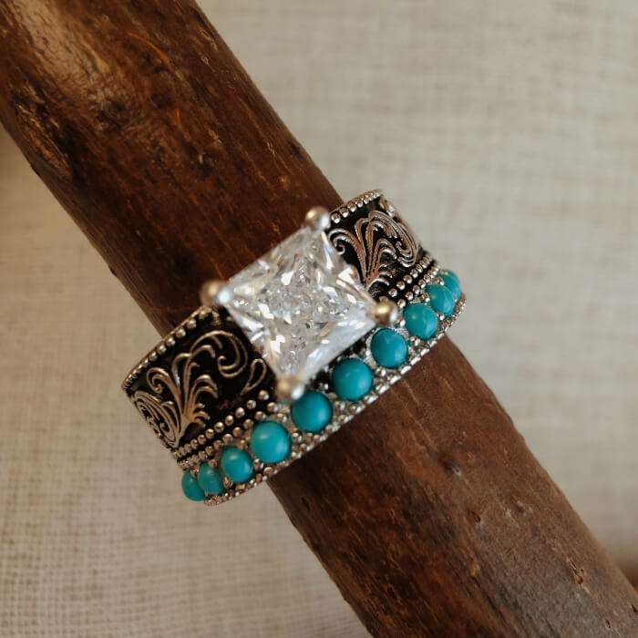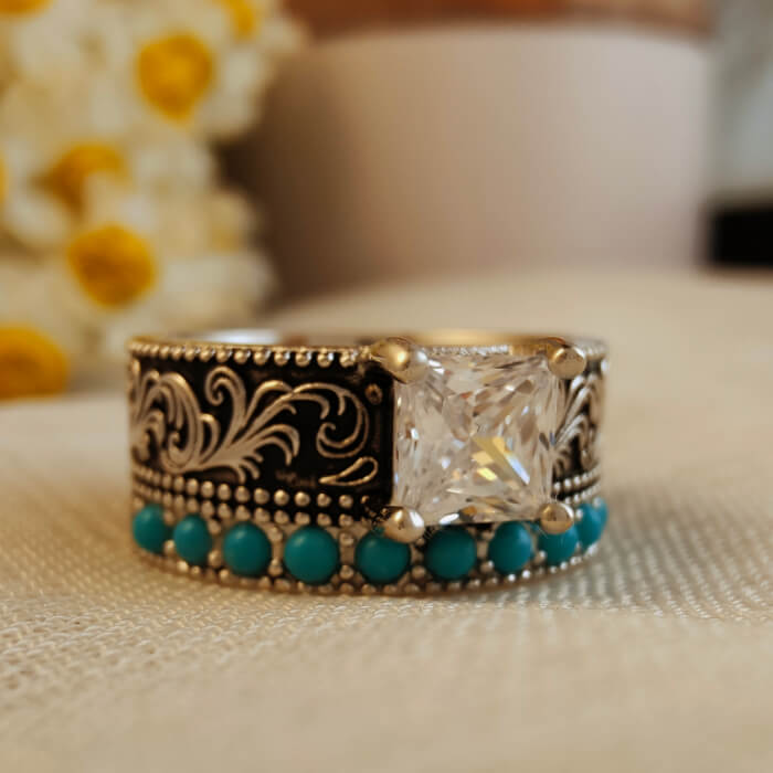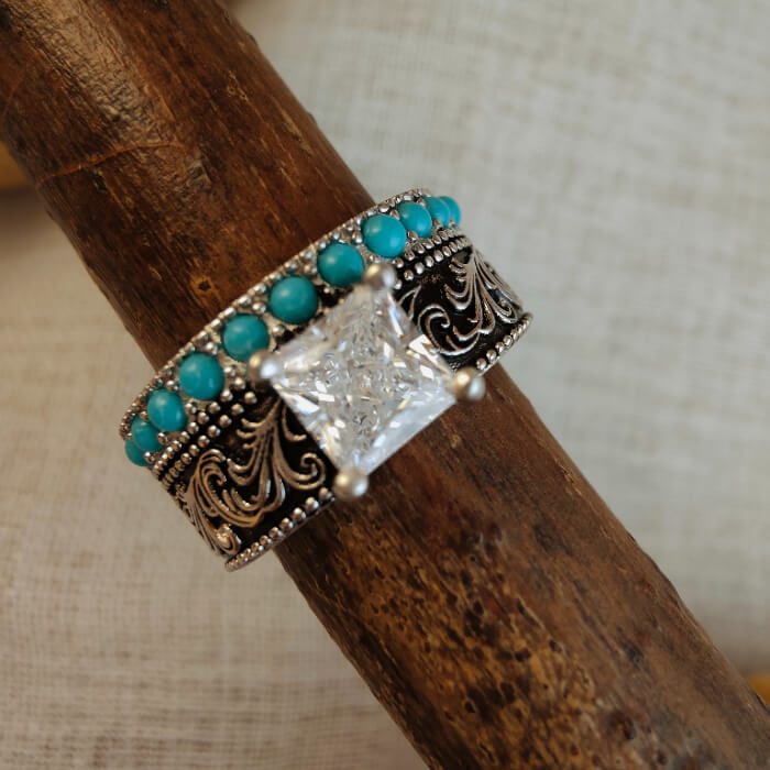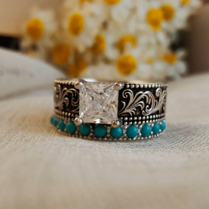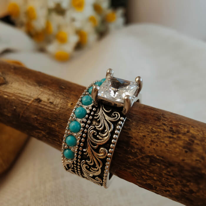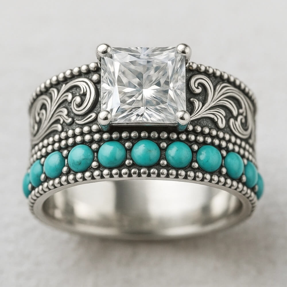 This bold Western engagement ring features a striking princess-cut center stone framed by intricate vintage silver scrollwork and a row of vibrant turquoise accents. The combination of the square-cut crystal and natural turquoise creates a powerful contrast — refined yet rugged, classic yet unmistakably Western.