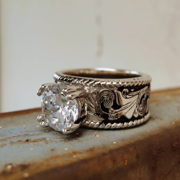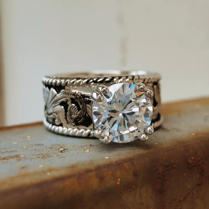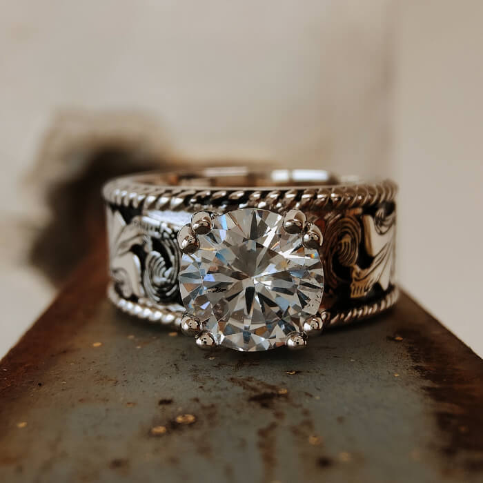 Western Engraved Silver Engagement Ring – Vintage Round Cut Statement Band