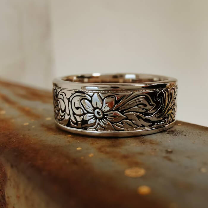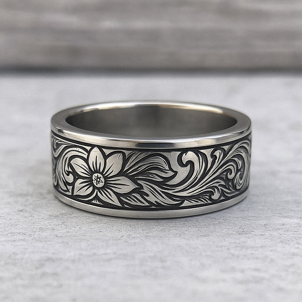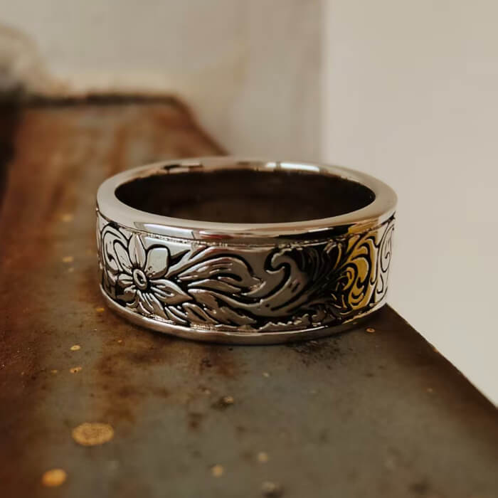 Inspired by the artistry of the Old West, this Western Floral Engraved Ring features intricate flower and vine scrollwork carved into a polished silver band. The oxidized detailing highlights every curve and petal, giving this piece a bold, timeless look. Designed for both men and women, it’s a perfect blend of rugged cowboy charm and refined craftsmanship.