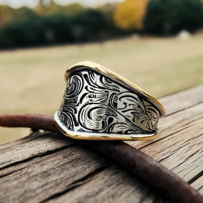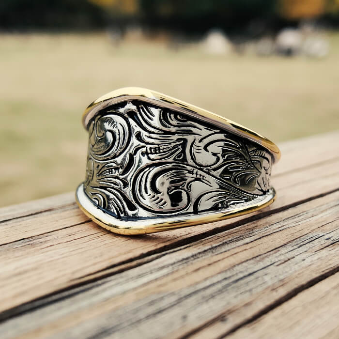 This Western Gold Edge Engraved Ring showcases a bold wide-band silhouette framed by polished gold edges.