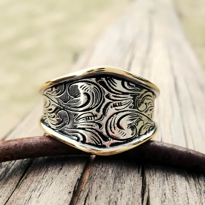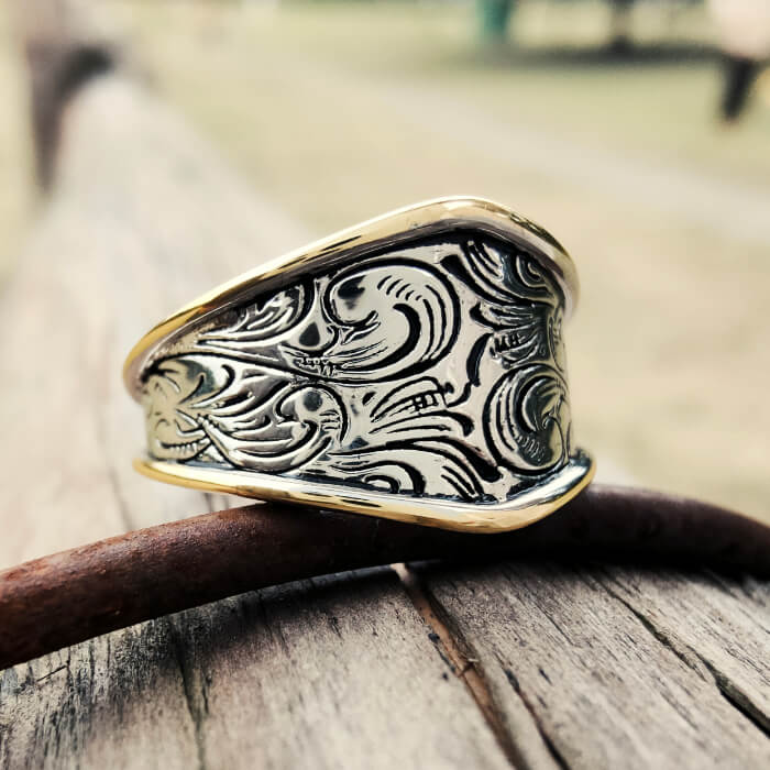 The silver center is hand-carved with swirling Western scrolls, giving the piece a timeless artisan texture and a modern sculptural feel.