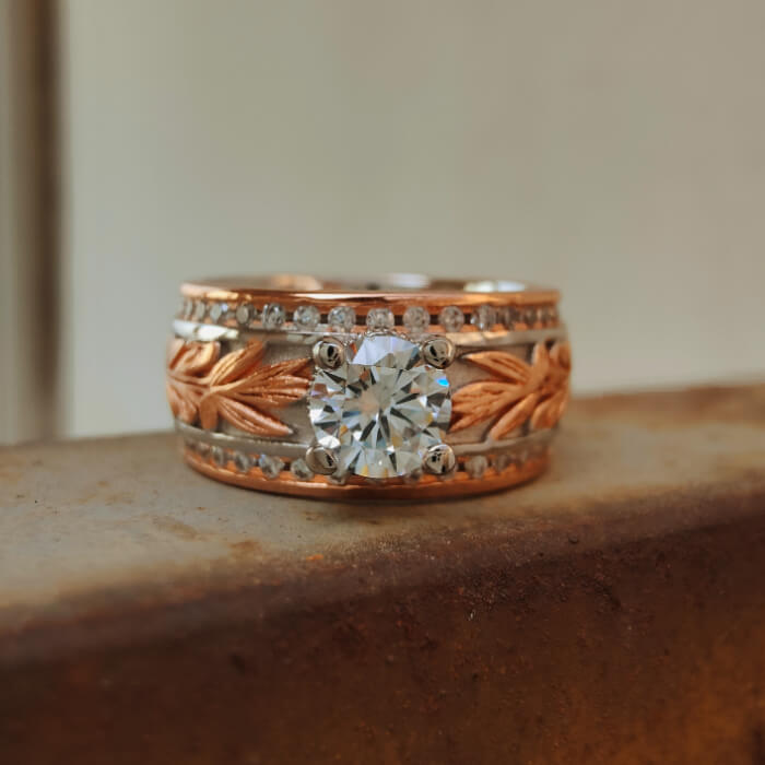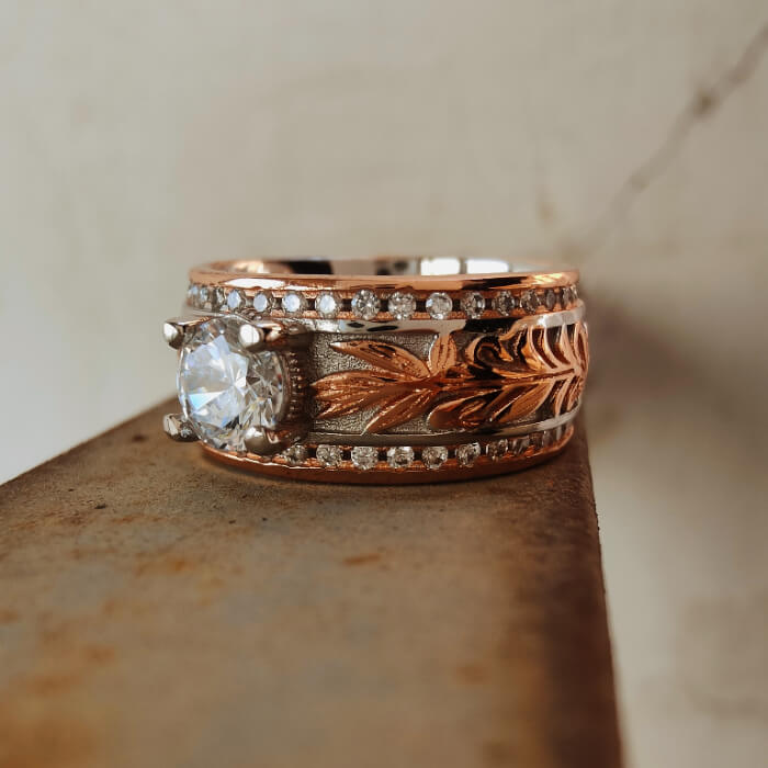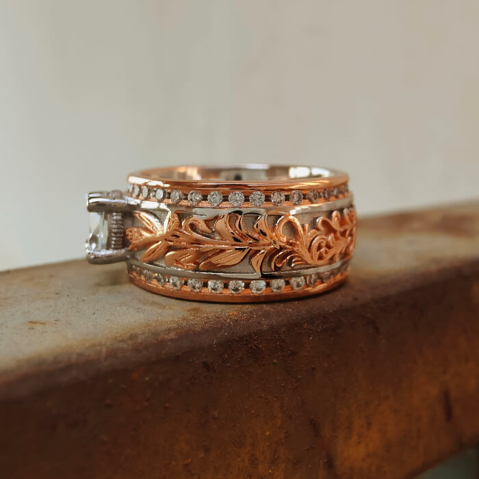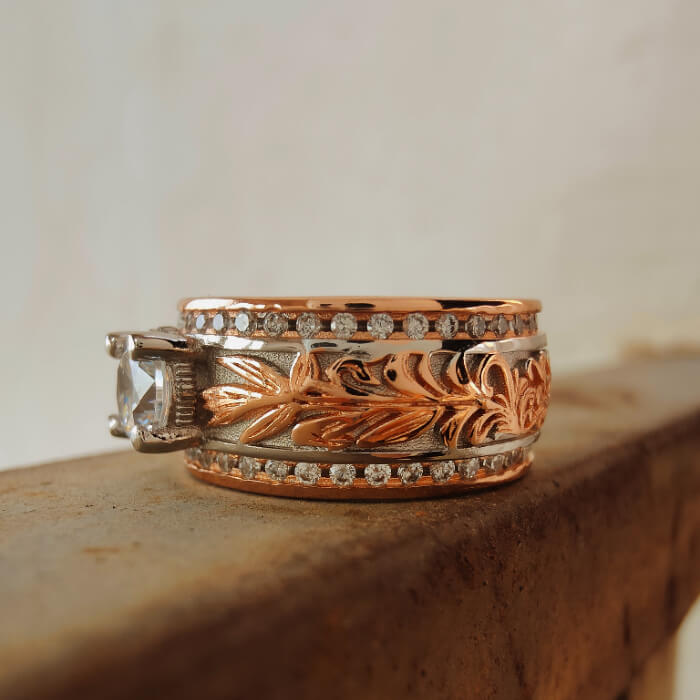 Western Leaf Engraved Ring – White Gold Plated Vintage Rose Gold Band