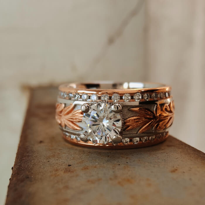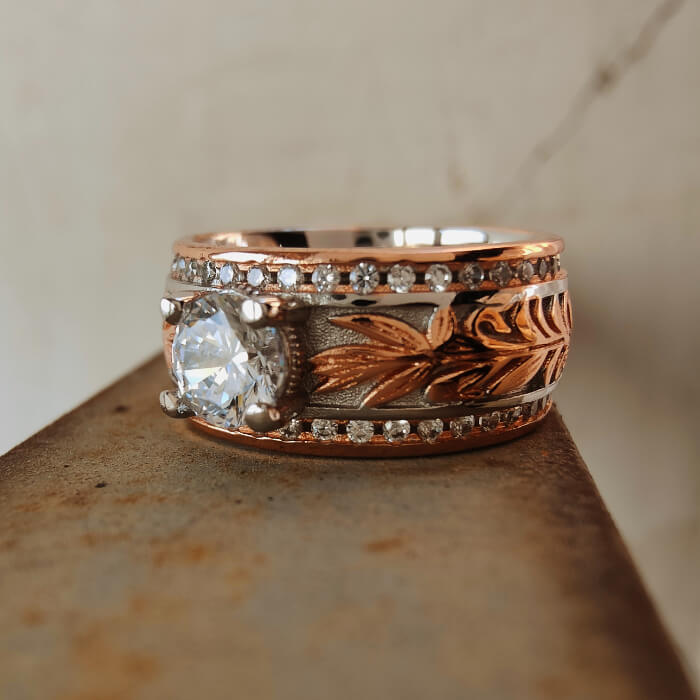 Inspired by classic Western craftsmanship, this Western leaf engraved ring features detailed vine and leaf patterns framed by a soft rose gold tone. A brilliant round-cut clear stone sits at the center, adding balance and elegance to the bold vintage design.
