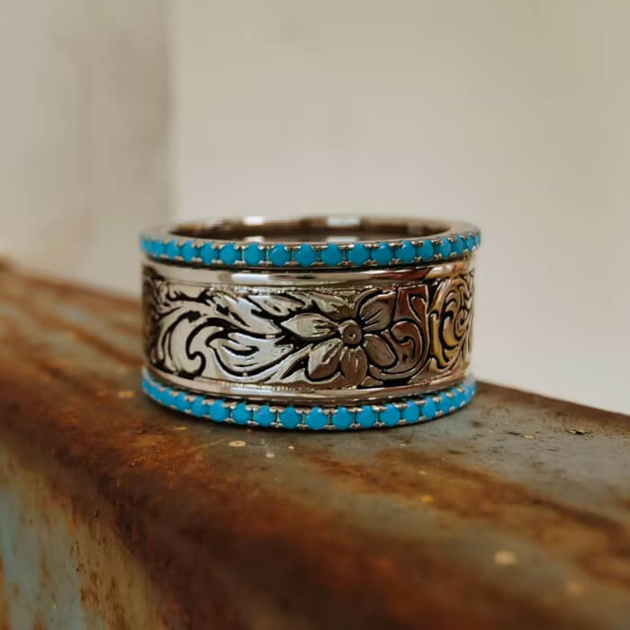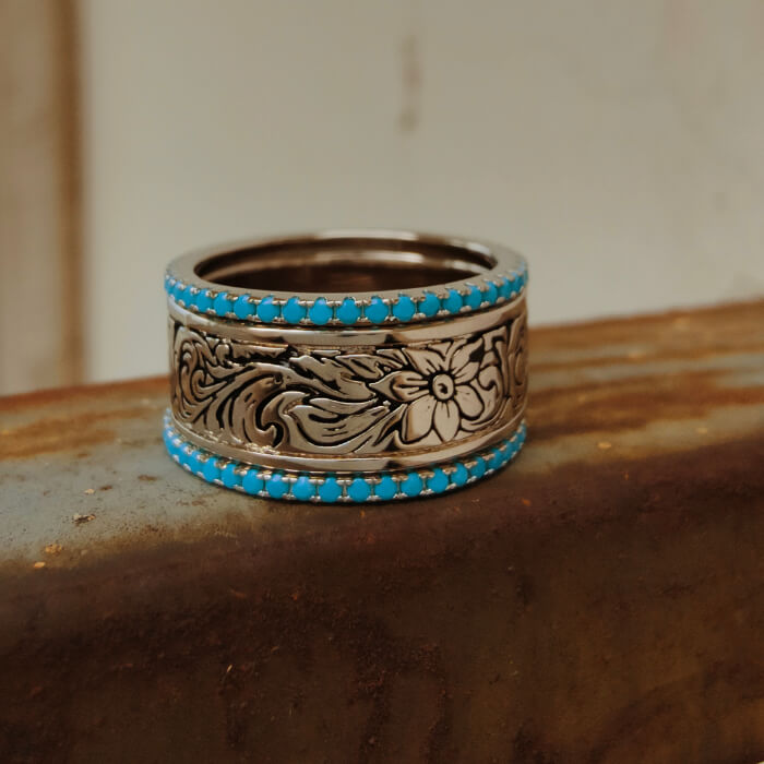 Inspired by the desert sky and Western heritage, this Western Turquoise Band Ring features a wide silver band engraved with floral scrolls and framed by turquoise accents.