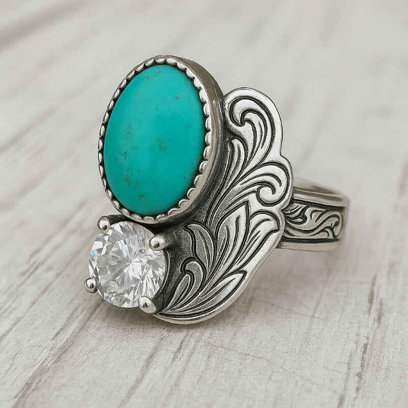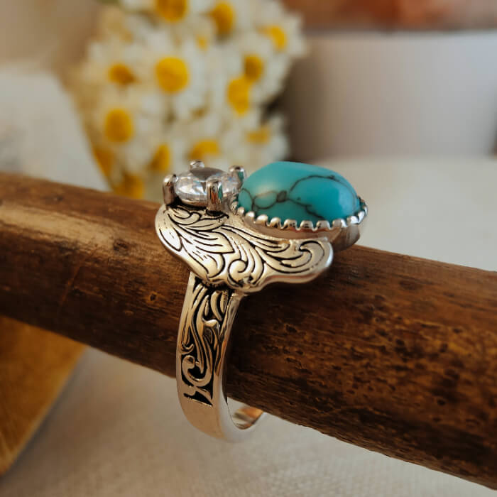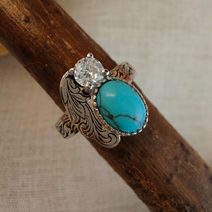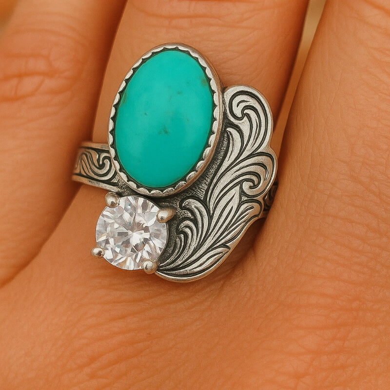 This elegant Western turquoise ring features a vivid oval turquoise stone paired with a sparkling crystal accent, set against beautifully engraved silver feather details. The flowing wing-inspired design symbolizes freedom and strength, while the contrast between turquoise and crystal creates a refined yet distinctly Western look.