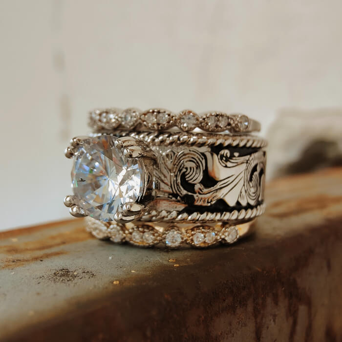 Featuring a wide silver-engraved band framed by sparkling pavé borders, this trio shines with a bold round-cut crystal centerpiece — a perfect union of Western artistry and vintage romance.